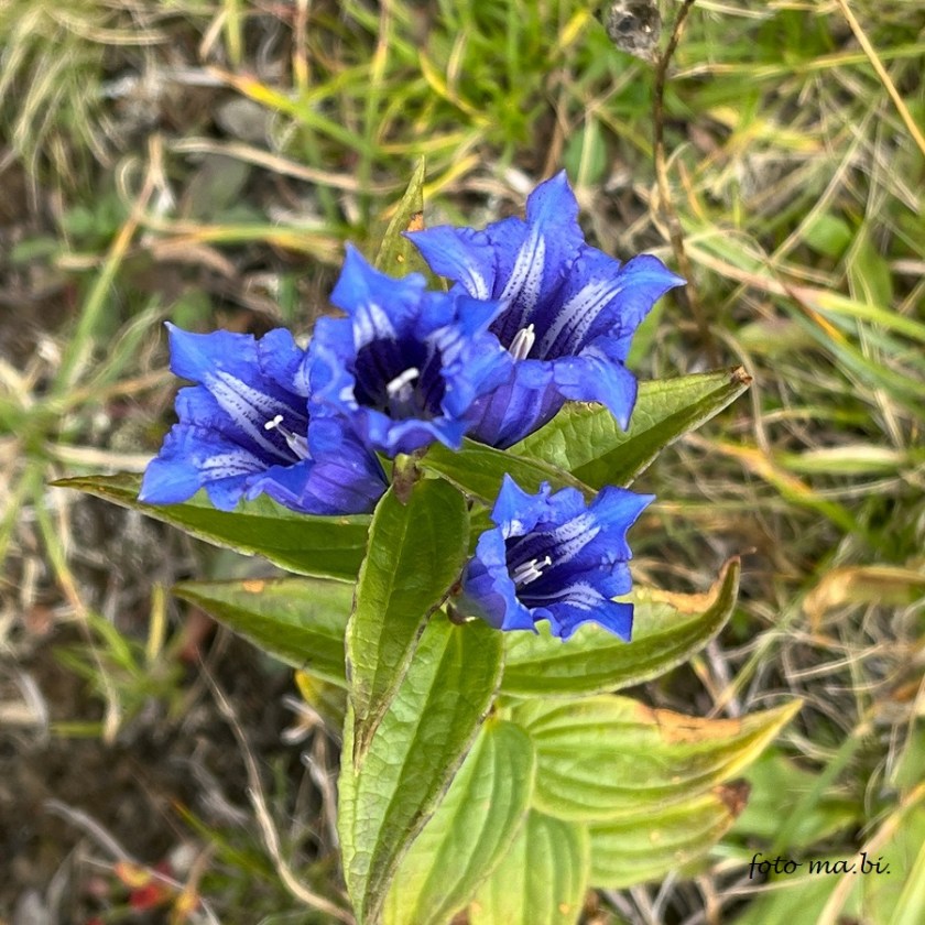 Auch Enzianarten blühen bis spät in den Herbst: im September finden wir den Schwalbenwurz-Enzian (Gentiana asclepiadea), im Oktober noch den Fransen-Enzian (Gentianopsis ciliata, früher Gentiana c.) und den Rätischen Kranzenzian (Gentianella rhaetica) mit fünfteiliger Krone.