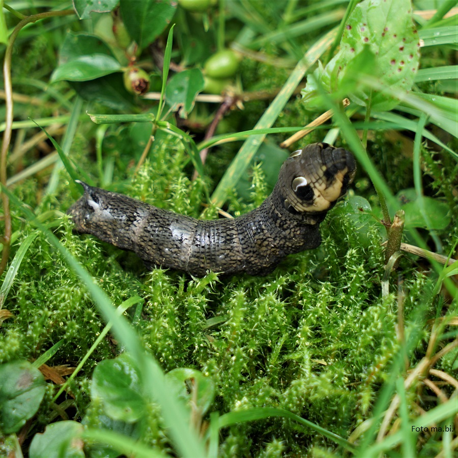 Die auffällige Raupe mit den großen Augenflecken haben wir schon öfter im Garten gefunden, den Falter bisher noch nie. Kein Wunder, der Mittlere Weinschwärmer (Deilephila elpenor) ist dämmerungs- und nachtaktiv. Jetzt hat er sich erstaunlicherweise schon am hellen Nachmittag blicken lassen und ich habe mich über den wunderschönen, weinrot gefärbten Schwärmer gefreut. Die bevorzugten Futterpflanzen der Raupe sind Weidenröschen und davon gibt es einige in meinem Garten. 03. 07. 2023
