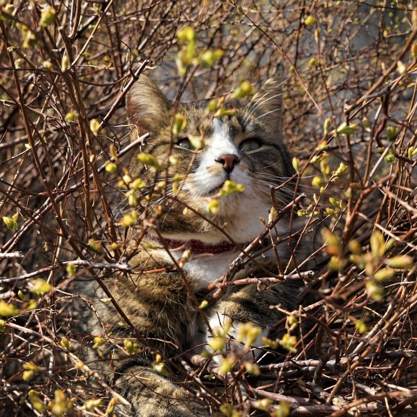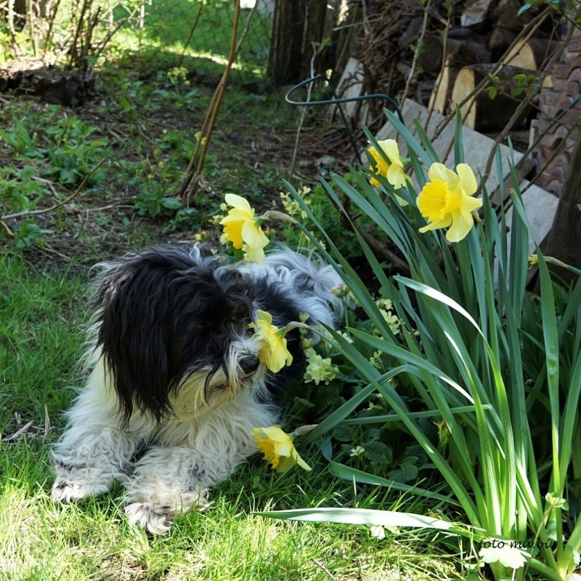 Der April ist zwar schon fortgeschritten, aber im Garten blühen gerade die Narzissen (Sorte Carlton) und so passen die Bilder zum Zustand der Natur. Und Maya liebt ihren versteckten Platz im Spierstrauch. 21. 04. 2023