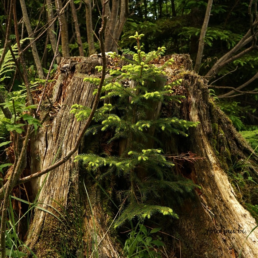 Die kleine Fichte kann wohlbehütet und mit idealem Nährstoffangebot im Schutz eines Baumstumpfs aufwachsen.