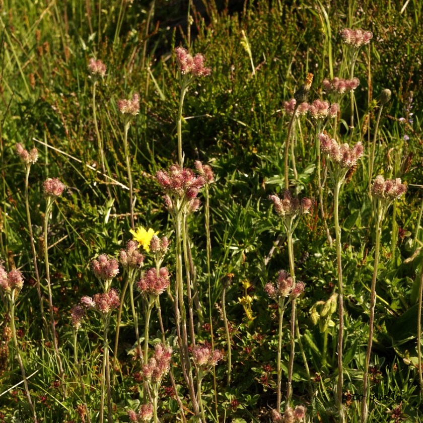 Auch wir Zweibeiner mussten sorgfältig darauf achten, die Bergschuhe nicht auf die kleinen Kostbarkeiten zu setzen und auch die übrige Bergflora nicht zu stören: das Schmalblättrige und das Scheidige Wollgras (Eriophorum angustifolia und E. vaginatum), den punktierten Enzian (Gentiana punctata) oder die Katzenpfötchen (Antennaria dioica). Bitte vormerken: die nächste AHO-Exkursion im Allgäu findet am 05. Juli statt. 23. 06. 2025