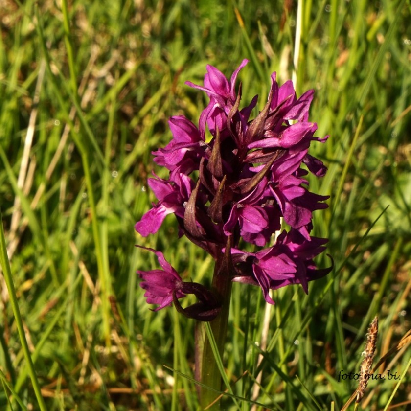 Unsere heimischen Orchideen sind im Erscheinungsbild sehr variabel und sie gehen gerne fremd: sie halten sich nicht an Artgrenzen, sondern bilden oft Hybride. So haben wir zahlreiche Pflanzen gesehen, die dem Breitblättrigen Knabenkraut ähnlich waren, aber mit kleinerem, lockeren Blütenstand und leicht einseitswendig. Da war offenbar das Lappländische Knabenkraut beteiligt.