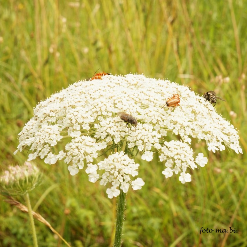 Die weißen Doldenblütler wie die wilde Möhre (Daucus carota) sind immer ein beliebter Landeplatz für Insekten. In den nahen Streuwiesen freuten wir uns über letzte Sumpf-Gladiolen (Gladiolus palustris). 24. 07.2025