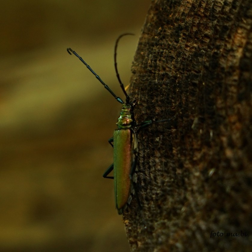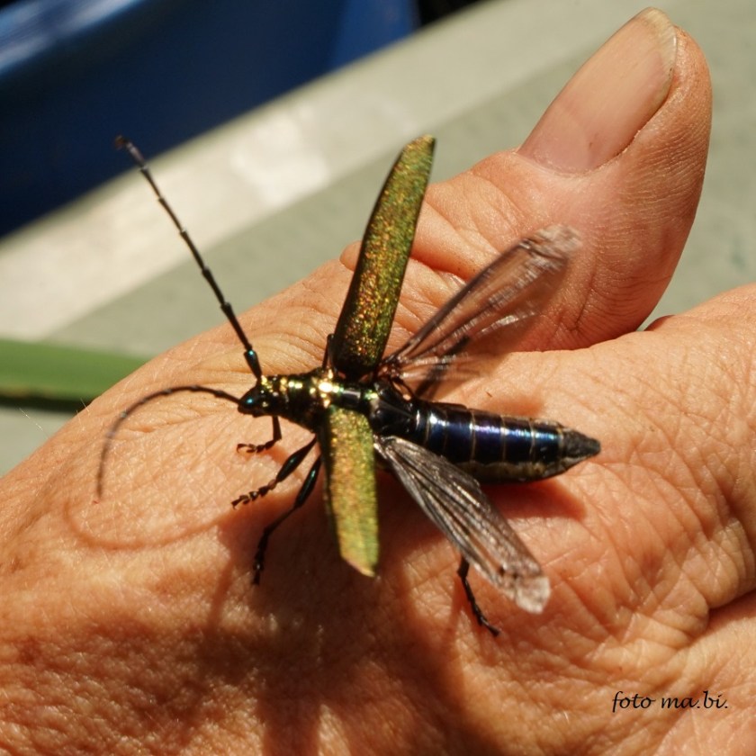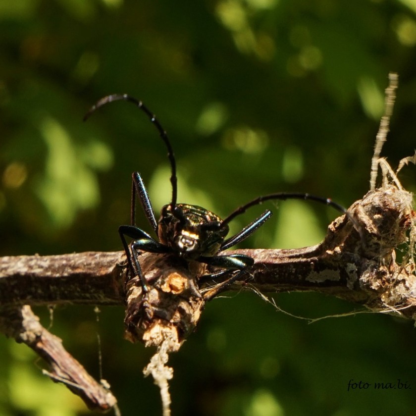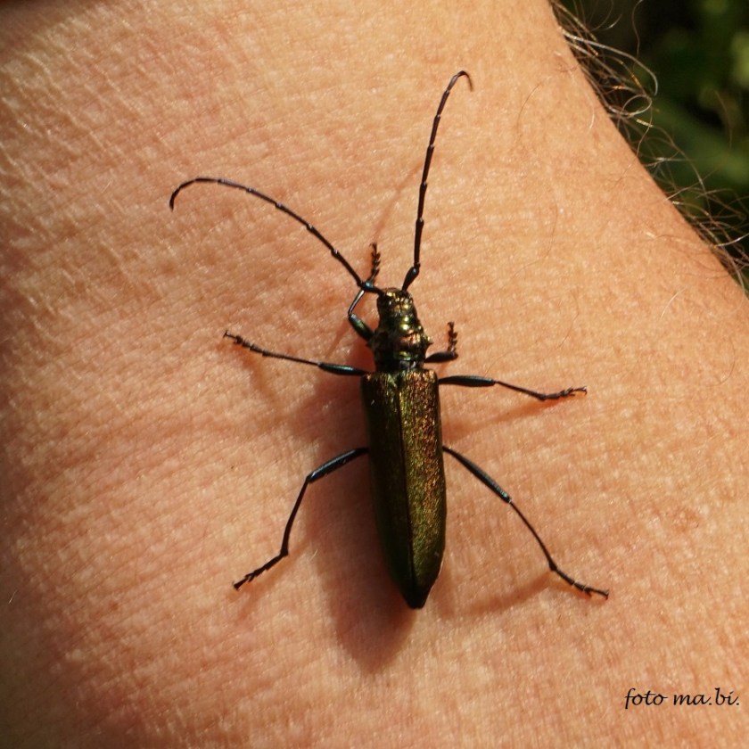 Einen besonders hübschen Gast entdeckten wir heute im Garten: einen je nach Sonneneinstrahlung metallisch grün oder braun schimmernden Bockkäfer, wohl ein Moschusbock (Aromia moschata), der zum Glück darauf verzichtet hat, sein stark riechendes Sekret auf dem menschlichen Arm zu verteilen.