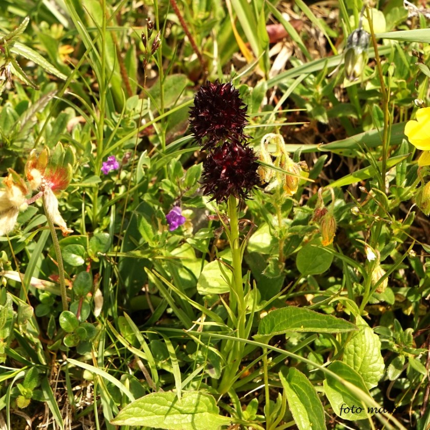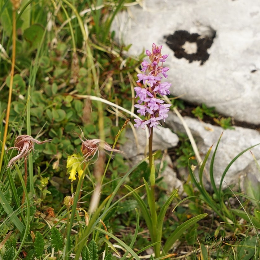 Sie leuchtet von weitem, die prachtvolle Hybride von Kohlröschen x Alpen-Händelwurz (Nigritella rhellicani x Gymnadenia alpina) und auch beide Elternteile stehen in der Nähe.