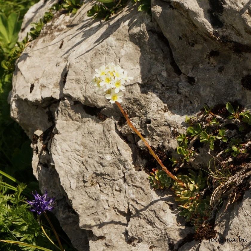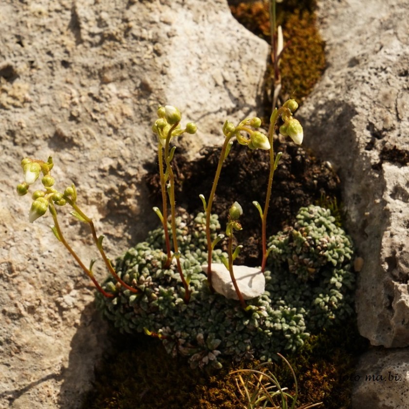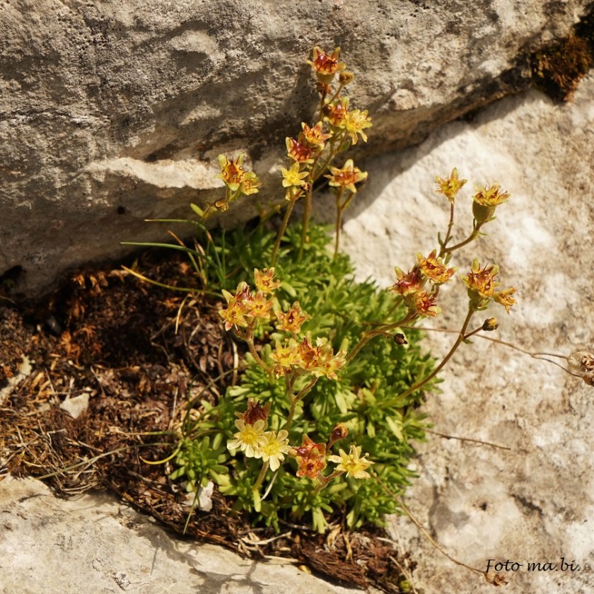 Gleich mehrere Steinbrecharten (Saxifraga paniculata, S. caesia, S. moschata) wachsen nahe beieinander auf dem Felsen.