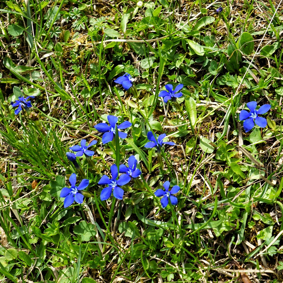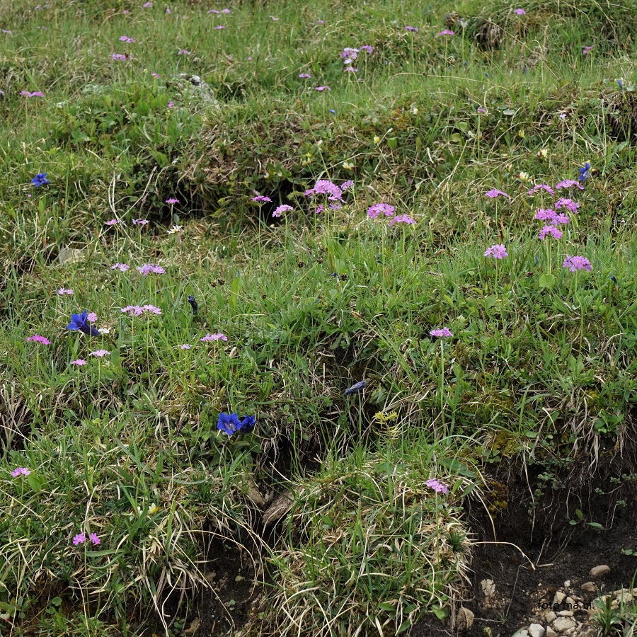 Ziemlich durchnässt, aber begeistert sind wir von der Wanderung heimgekommen. An den Nordhängen der Allgäuer Alpen zeigt sich auf etwa 1400 m Höhe der Bergfrühling in voller Pracht. Das leuchtende Blau des Enzians (Gentiana verna und Gentiana clusii) und das zarte Rosa der Mehlprimel (Primula farinosa) begleitet uns fast auf dem gesamten Weg.