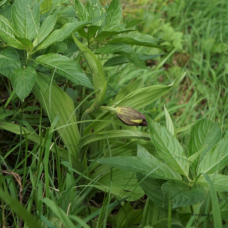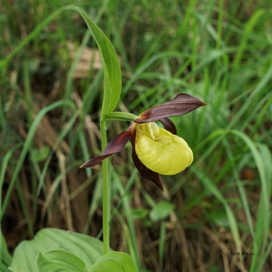 Fast hätten wir sie übersehen: die Blütenknospe des Frauenschuhs (Cypripedium calceolus) versteckt sich im dichten Grün des Steilhangs. Und dann steht auch noch eine erste, prächtige Blüte dieser größten heimischen Orchidee vor uns.