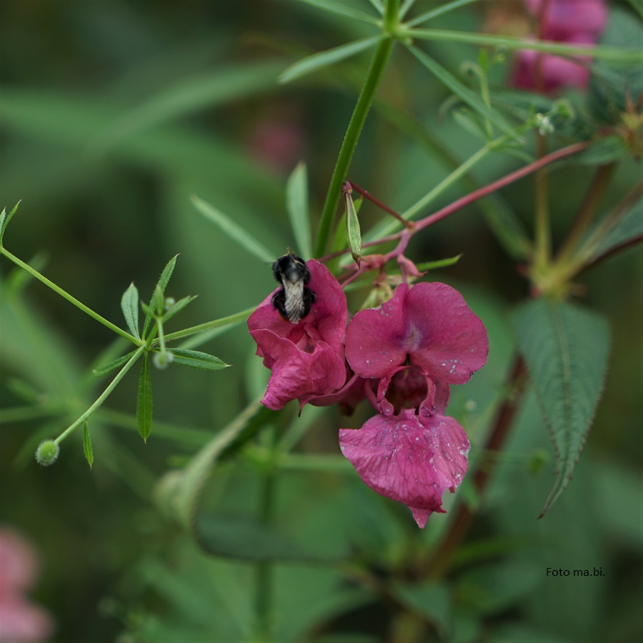 Herbstlich zeigt sich auch die Acker-Kratzdistel (Cirsium arvense), die ihre Samen dem Wind überlässt. Das hübsche Drüsige Springkraut (Impatiens glandulifera) blüht noch weit in den Herbst hinein. Es gilt als invasiver Neophyt, der heimische Pflanzen verdrängt und deshalb stellenweise bekämpft wird. Aber für eine Eindämmung ist es längst zu spät.