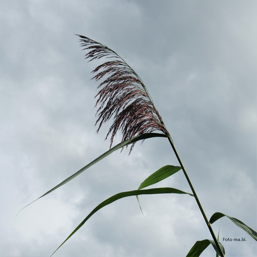 Gleich daneben macht sich ein „Breitwegerich“ breit, der sich bei genauem Hinsehen als Mittlerer Wegerich (Plantago media) entpuppt, wie der lange Blütenstängel und die Blattansätze verraten. Und noch zwei passen gut zusammen: der schon herbstliche Wind und das Schilf (Phragmites australis). 28. 08. 2020