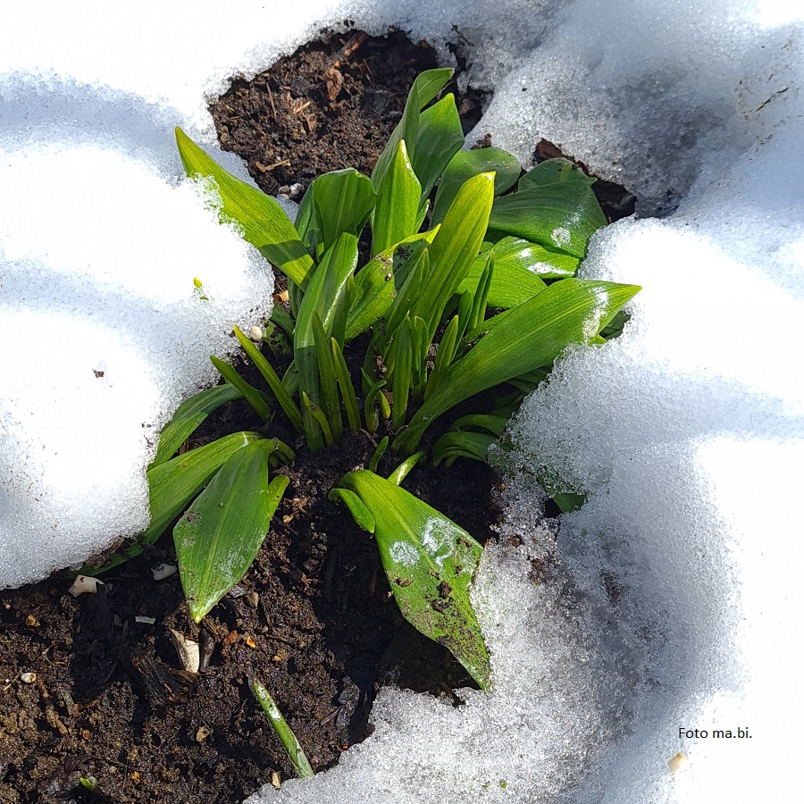 Der Bärlauch hat ein paar gelbe Spitzen, ist aber trotzdem bald erntereif – falls es nicht wieder eisig wird. Aber heute heißt es im Garten: Schneeschmelze! 25. 03. 2021