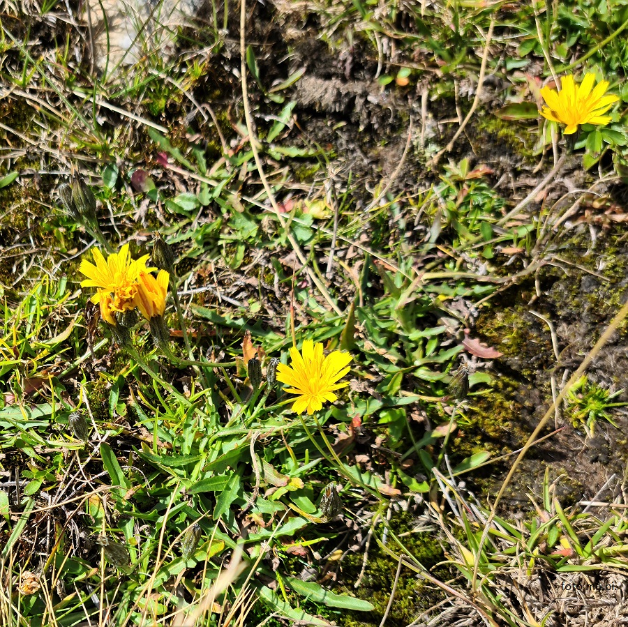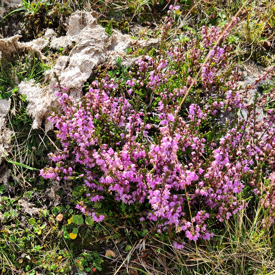 Bei dem gelben Korbblütler dachte ich zunächst an den Rauen Löwenzahn (Leontodon hispidus), aber der liebt Kalkboden und damit stimmt der Standort nicht. Kann es das Schweizer Milchkraut (Leontodon helveticus) sein? Ein echter Herbstblüher und offenbar überall zuhause ist die Besenheide, Calluna vulgaris.