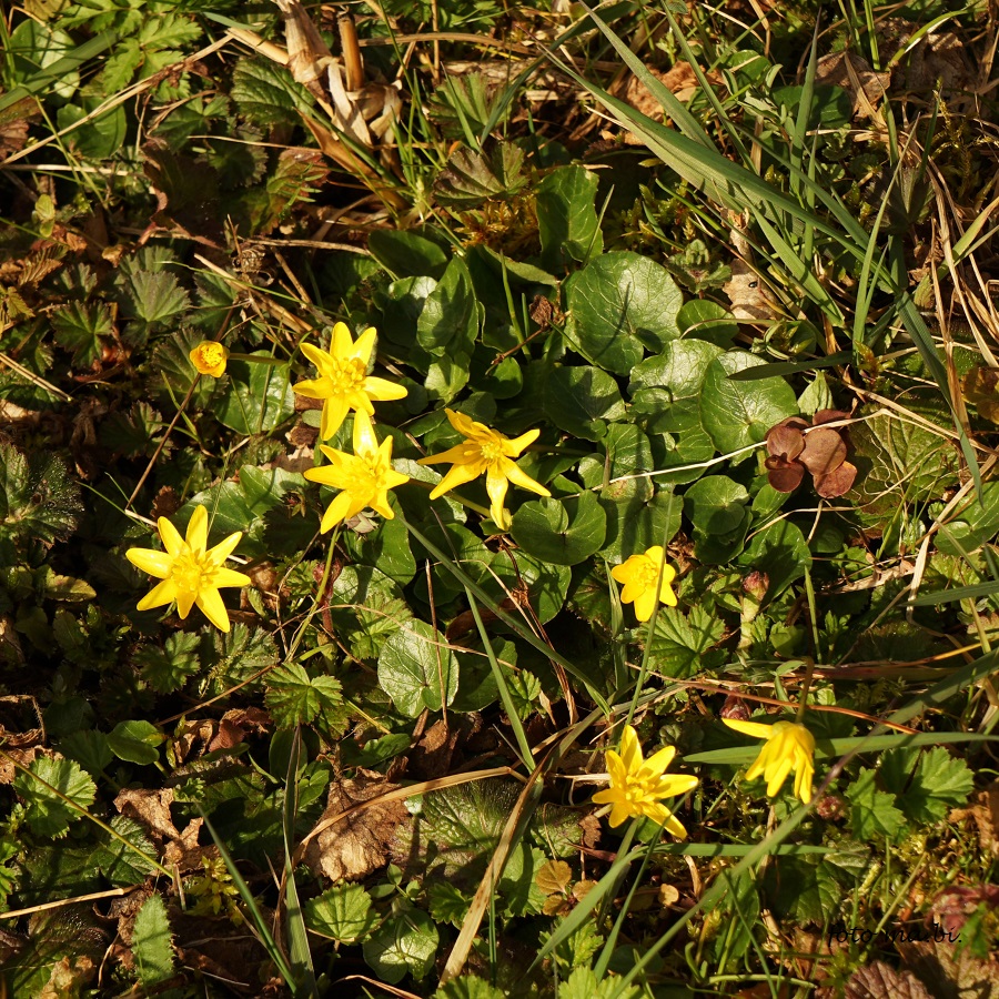 Zugleich künden verschiedene Gelbtöne vom Frühling: hellgelb die Schlüsselblume (Primula eliator), leuchtend gelb das Scharbockskraut (Ficaria verna = Ranunculus ficaria ssp. bulbifer) und am Bach die Sumpf-Dotterblume (Caltha palustris).