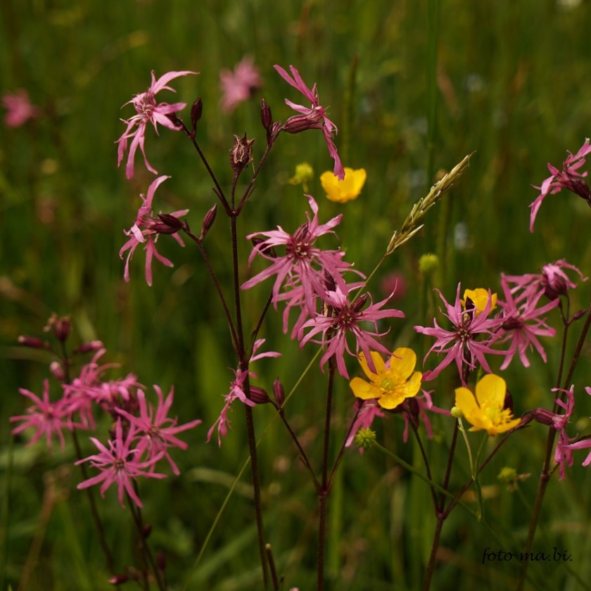 Im renaturierten Moos und den begleitenden Streuwiesen erwartet uns jetzt eine Blütenfülle mit Kuckucks-Lichtnelke (Silene flos-cuculi), Bachnelkenwurz (Geum rivale), Bach-Kratzdistel (Cirsium rivulare) und Schmalblättrigem Wollgras (Eriophorum angustifolium).