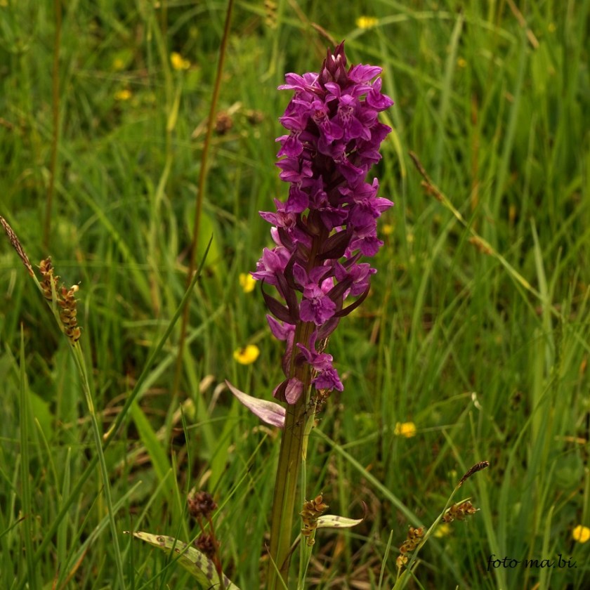 In kräftigem Purpur leuchten Orchideen wie das Breitblättrige Knabenkraut (Dactylorhiza majalis), dazwischen auch kleinere Pflanzen mit weniger Blüten im oft einseitswendigen Blütenstand, wohl das Lappländische Knabenkraut (Dactylorhiza lapponica) oder eine Hybride.